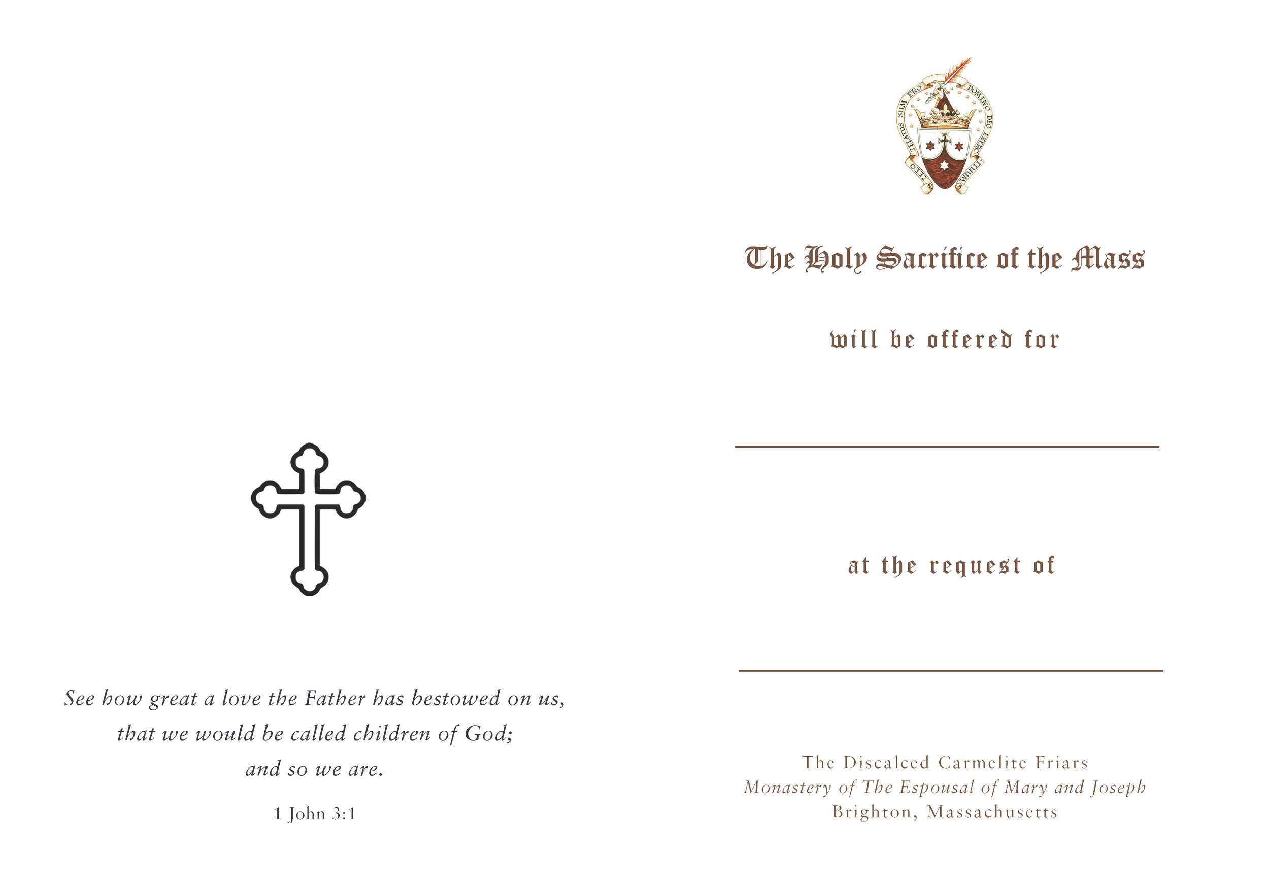 Request a Mass for you or your loved ones. The Holy Sacrifice of the Mass may be offered for the living as well as the deceased. The Mass Card will be personalized and mailed to your recipient within 3 business days of receipt of your order.